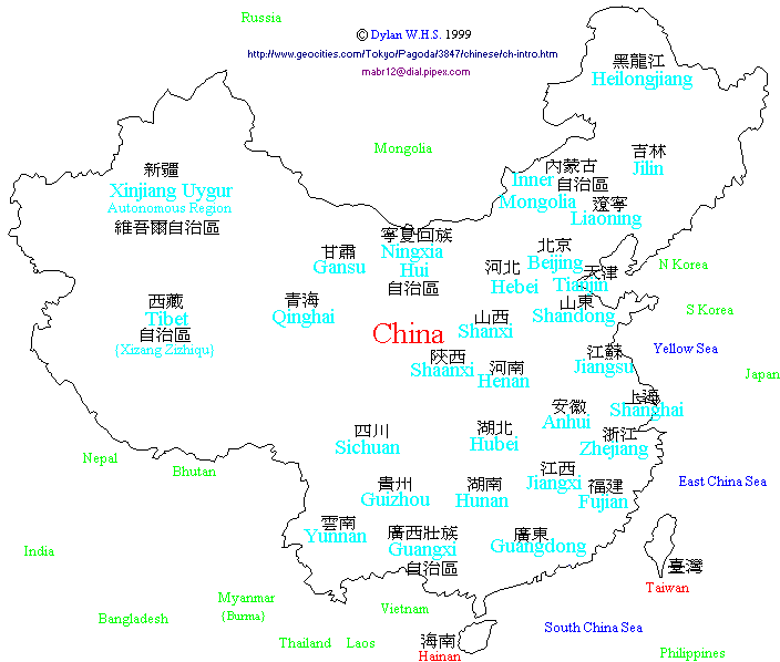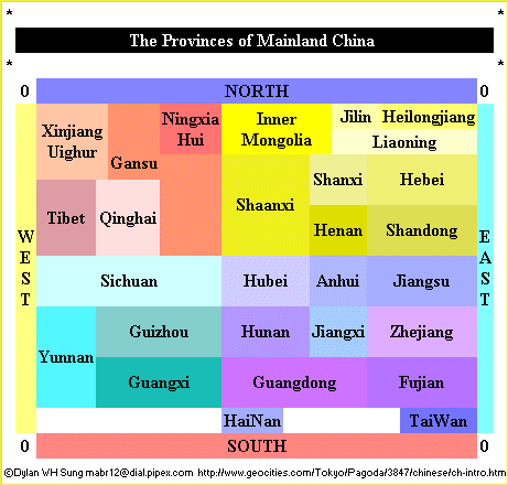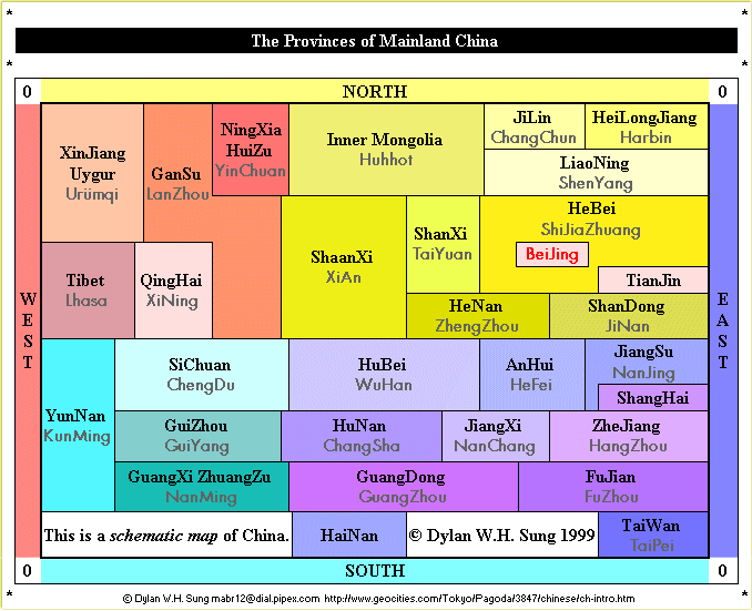 By actual comparison with a map of the provinces, we must then move the borders around in this simplified map so that true neighbour to neighbour correspondence between provinces is achieved. The results are below, this time with the inclusion of Beijing, Tianjin and Shanghai. I have also included the names of the principle cities in each province.