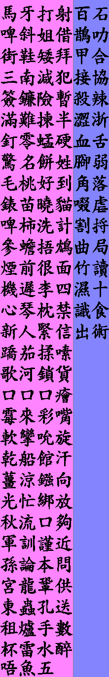 20 Initials =========== Bad Puppy Man Handle Fun Vole Daft b.. p.... m.. h..... f.. v... d... sTDuff Nice Lounge Green Kite Zorro youNGer td.... n... l..... g.... k... z.... ng..... Song SHeet Job biTS Top CHance s... sh... j.. ts.. t.. ch.... b, ch, d, f, g, h, j, k, l, m, n, ng, p, s, sh, t, td, ts, v, z 153 Basic Rimes ================ 1 2 3 4 -a 馬m 牙ng 打d 射s 1 -ai 街g 鞋h 矮. 拜b 2 -am 三s 南n 減g 犯f 3 -an 滿m 難n 揀g 半b 4 -ang 釘d 零l 蜢m 硬ng 5 -au 毛m 桃td 好h 到d 6 -e 啤b 柿s 洗s 計g 7 -em 參s 蟾ng 捂. 鴆ts 8 -en 煙z 前t 很h 面m 9 -i 機g 遲t 李l 四s 10 -ia 啤b 斜ch 姐j 借j 11 -iam 簽ch 鐮l 險h 暫ch 12 -iang 驚g 名m 餅b 姓s 13 -iau 錶b 苗m 曉h 貓m 14 -im 心s 琴k 枕ts 禁g 15 -in 新s 人ng 緊g 信s 16 -io 蹻k 茄k 揉ng 嗉s 17 -ioi * * * 癐k 18 -ion 軟ng 攣l 吮ch 旋ch 19 -iong 薑g 涼l 鏹k 向h 20 -iu 秋ch 流l 口h 夠g 21 -iun 軍g 群k 謹g 近k 22 -iung 宮g 龍l 鞏g 供k 23 -o 歌g 河h 鎖s 貨f 24 -oi 霉m 來l 彩t 嘴ts 25 -on 乾g 船s 館g 汗h 26 -ong 光g 忙m 綁b 放f 27 -un 孫s 論l 本b 問m 28 -u 租ts 爐l 手s 數s 29 -ui 杯b 雷l 水s 醉ts 30 -ung 東d 蟲t 孔k 送s 31 m 唔 魚 五 * 0b 5 6 -ak 百b 石s 1 -ap 甲g 合h 2 -at 殺s 辣l 3 -ep 澀s 浙ts 4 -et 血h 舌s 5 -iak 鵲s 叻l 6 -iap 接j 協h 7 -iok 腳g 弱ng 8 -iot 啜j 虐ng 9 -ip 濕s 十s 10 -it 識s 食s 11 -iuk 曲k 局k 12 -ok 角g 落l 13 -ot 割g 捋l 14 -uk 竹ts 讀td 15 -ut 出t 術s 16 ===================================== 1 2 3 4 -a 馬 牙 打 射 -ia 啤 斜 姐 借 -ai 街 鞋 矮 拜 -am 三 南 減 犯 -iam 簽 鐮 險 暫 -an 滿 難 揀 半 -ang 釘 零 蜢 硬 -iang 驚 名 餅 姓 -au 毛 桃 好 到 -iau 錶 苗 曉 貓 -e 啤 柿 洗 計 -em 參 蟾 捂 鴆 -en 煙 前 很 面 -i 機 遲 李 四 -im 心 琴 枕 禁 -in 新 人 緊 信 -io 蹻 茄 揉 嗉 -o 歌 河 鎖 貨 -ioi * * * 癐 -oi 霉 來 彩 嘴 -ion 軟 攣 吮 旋 -on 乾 船 館 汗 -iong 薑 涼 鏹 向 -ong 光 忙 綁 放 -iu 秋 流 口 夠 -iun 軍 群 謹 近 -un 孫 論 本 問 -iung 宮 龍 鞏 供 -ung 東 蟲 孔 送 -u 租 爐 手 數 -ui 杯 雷 水 醉 5 6 -ak 百 石 -iak 鵲 叻 -ap 甲 合 -iap 接 協 -at 殺 辣 -ep 澀 浙 -et 血 舌 -iok 腳 弱 -ok 角 落 -iot 啜 虐 -ot 割 捋 -iuk 曲 局 -uk 竹 讀 -ip 濕 十 -it 識 食 -ut 出 術![]()